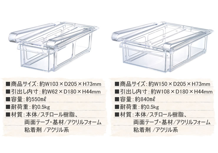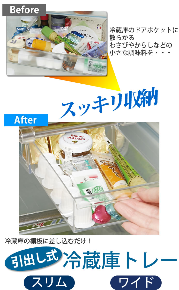 引出し式でスッキリ収納! 冷蔵庫の棚板に差し込むだけ!(厚み約1.2cmまでの棚板に差し込めます) わさびやからし等の小さな調味料の収納、整理に。